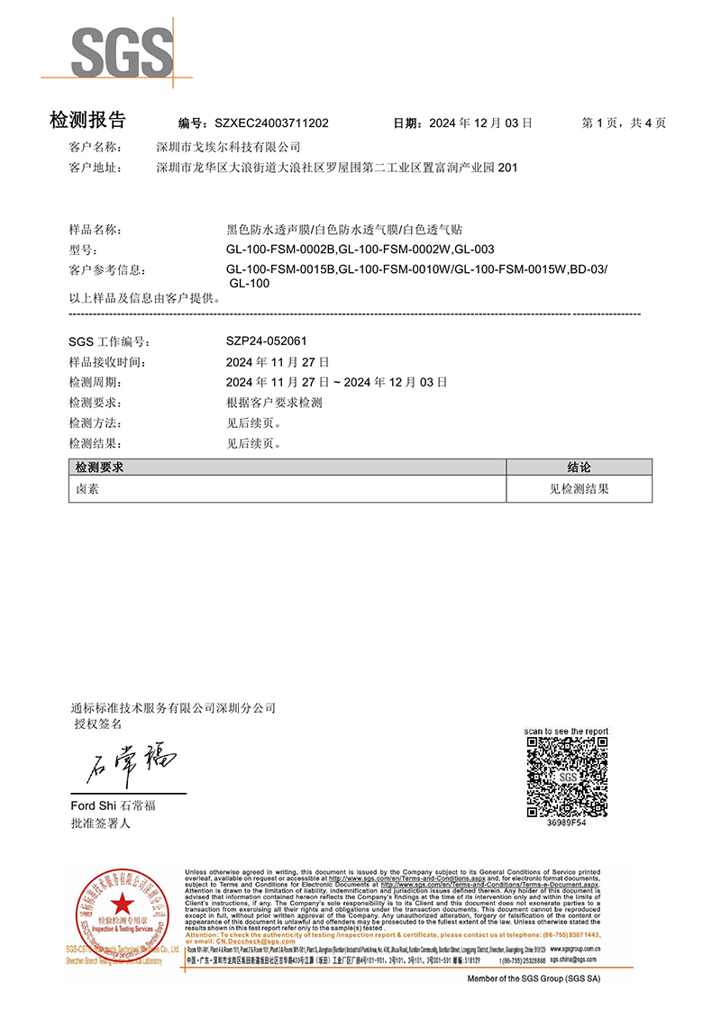 > 黑色防水透聲膜/白色防水透氣默默/白色透氣貼SGS檢測報告